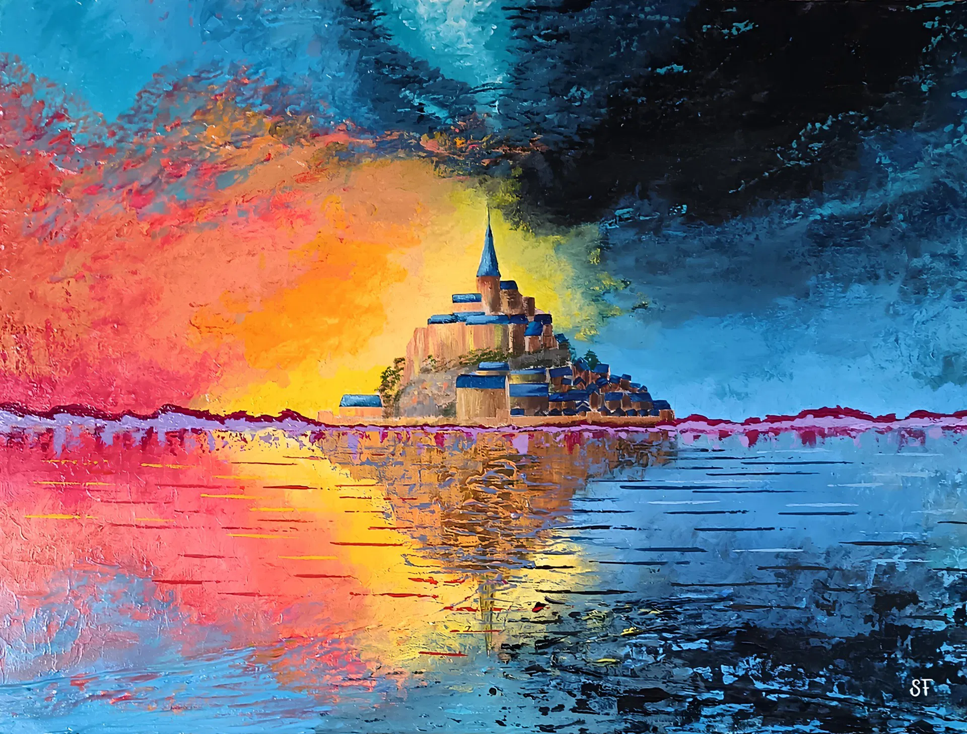 J’aime aussi faire la promotion d’un lieu, d’un site d’exception ou d’une région à travers mes toiles comme le Mont Saint-Michel, lieu que j'apprécie particulièrement. Avant la réalisation d’un thème, j’entreprends de nombreuses recherches historiques le concernant .Je me rends sur place à plusieurs saisons différentes, je fais des photos, des vidéos, je m'imprègne de l'ambiance sonore, olfactive et visuelle. J'arpente les rues en observant chaque recoin puis je me pose et je croque (dessine) le lieu. Là, j'ai ma base de travail puis je me lance sur ma toile en délimitant uniquement les contours. Les couleurs seront décidées en fonction de ce qui m'a marquée lors de ma visite (une trace rose dans le ciel par exemple). Rien n'est décidé en amont, c'est de l'improvisation totale et c'est ce que j'aime. Parfois ,je recommence de nombreuses fois avant de trouver la couleur qui va faire que je me connecte à ma toile. Une fois que j'ai réussi à harmoniser mes pensées et à les retranscrire sur la toile alors je dois savoir m'arrêter et ce n'est pas toujours facile!
